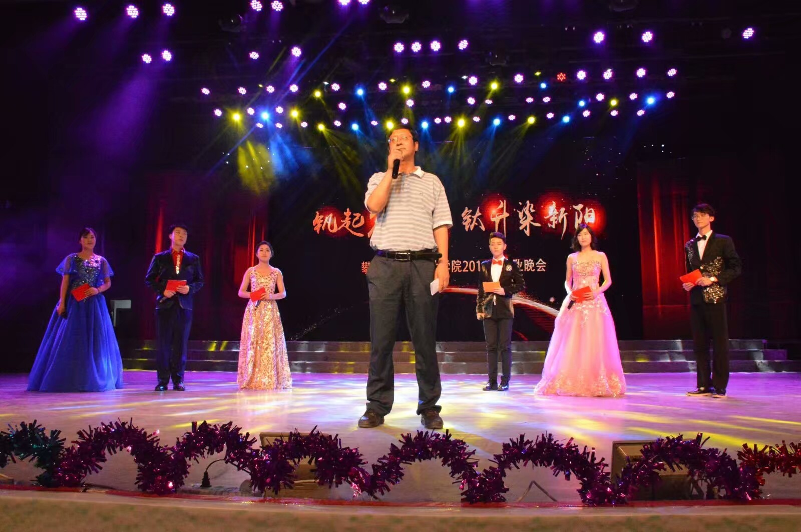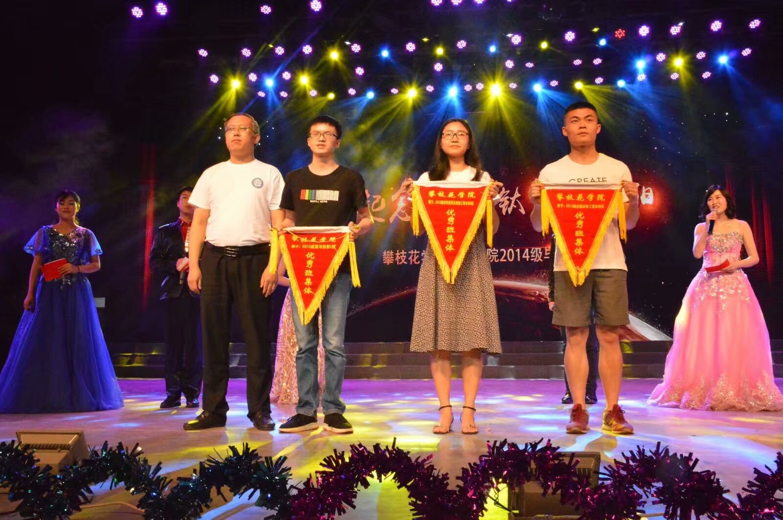 随后副校长石维富为晚会开场做讲话,他首先介绍了钒钛学院的“六个国字号”,并宣布了首届攀枝花学院-中科院过程班的学生名单,最后他衷心祝愿全体14级毕业生做到争做优秀校友,扬我钒钛声誉。钒钛学院副院长赖奇表彰先进集体及个人,优秀班级,学习标兵,优秀寝室。