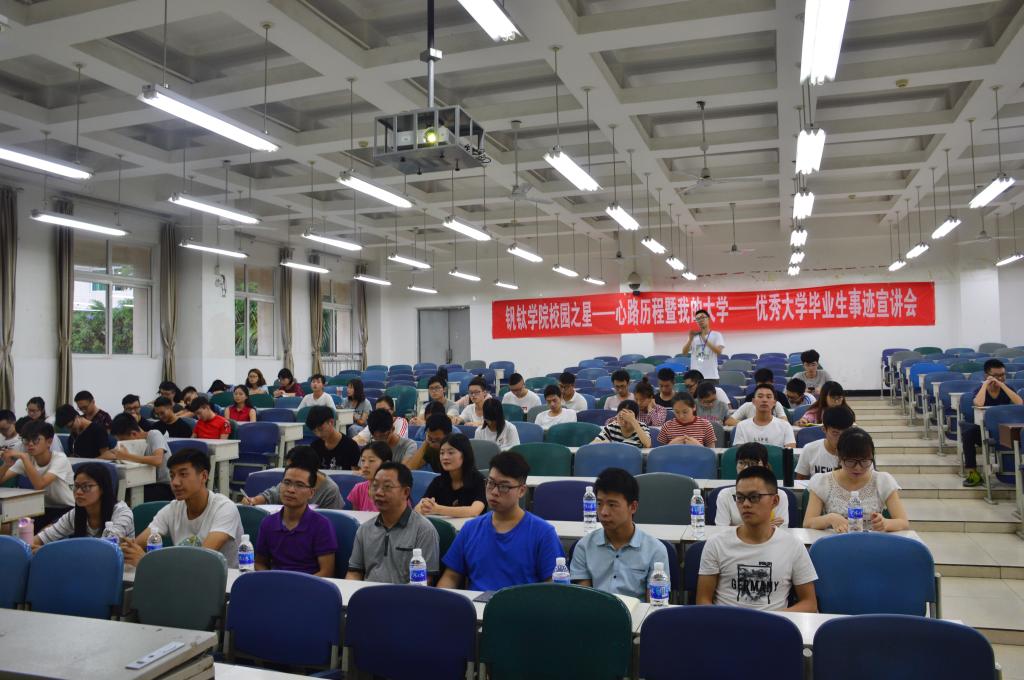 大会伊始,陈今良老师为我们讲述了本次宣讲会的意义在于提升钒钛学子的学习动力,为学院营造更好的学习风气。然后学习之星邱翠学姐和张琴学姐做了精彩的演讲,鼓励我们要对未来有个好的规划,不能随波逐流;做任何事情都要分主次;要对时间有个好的规划以及努力刻苦的重要性。之后创业之星蒋雪椒学姐为我们讲述了自己大一大二的精彩经历,鼓励我们多去体验生活,要有自己的目标,然后不放弃,努力去做好。要相信自己能行!