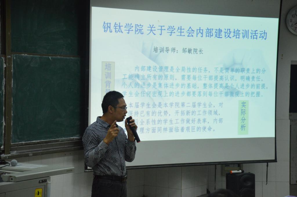 伊始,邹敏对学生会内部的建设进行分析。他指出,大家作为干部和干事,就应该做实事,为钒钛学院的建设做事,每个干部应该体感对自身的认识,明确自己的责任,保持原有的优点,开拓新的领域,为以后全院的学生工作做哈表率。然后则是指明钒钛学院的现在的教学任务和社会任务。