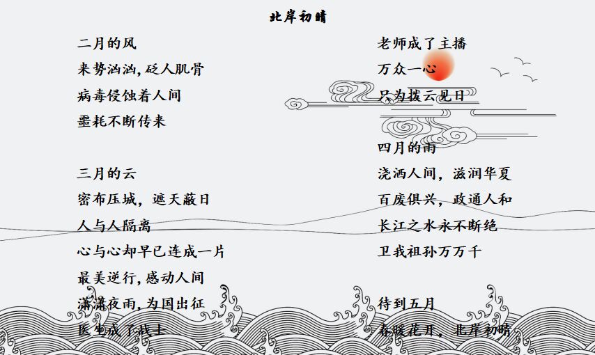 本次活动展现了同学们积极创作的热情、丰富的想象力和创新能力,也激发了同学们对传统文化的兴趣以及热情。活动最后通过计分制选出了最后几名优秀的作品,他们分别是:一等奖:程玉玲《人间四月天,天使在人间 》二等奖:赵金鹏 《北岸初晴 》, 杨兰琪 《少长登高一望乡 》三等奖:王燕 《汉韵佳人》, 罗霜霞 《沁园春.雪 》,伍海琦 《一亩红墙.花木同春 》。