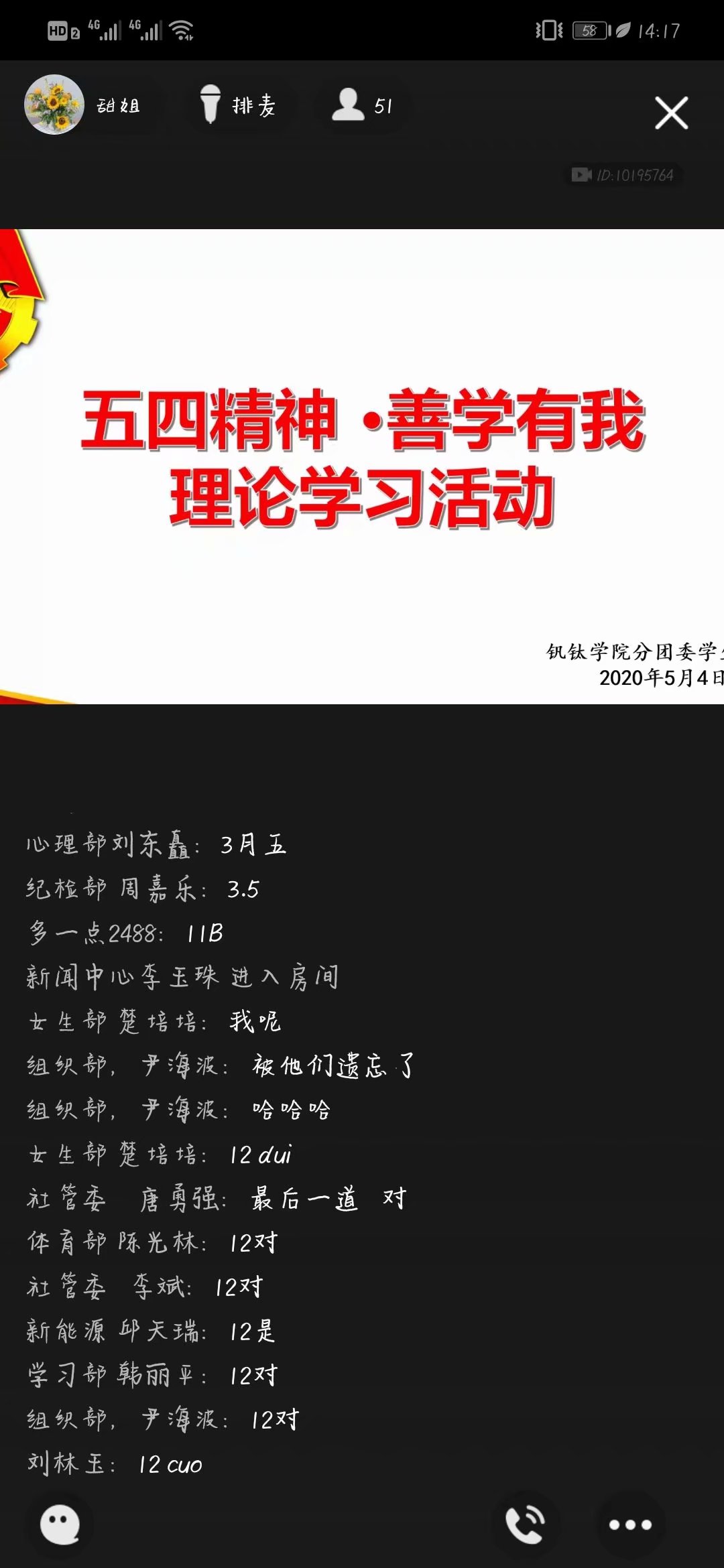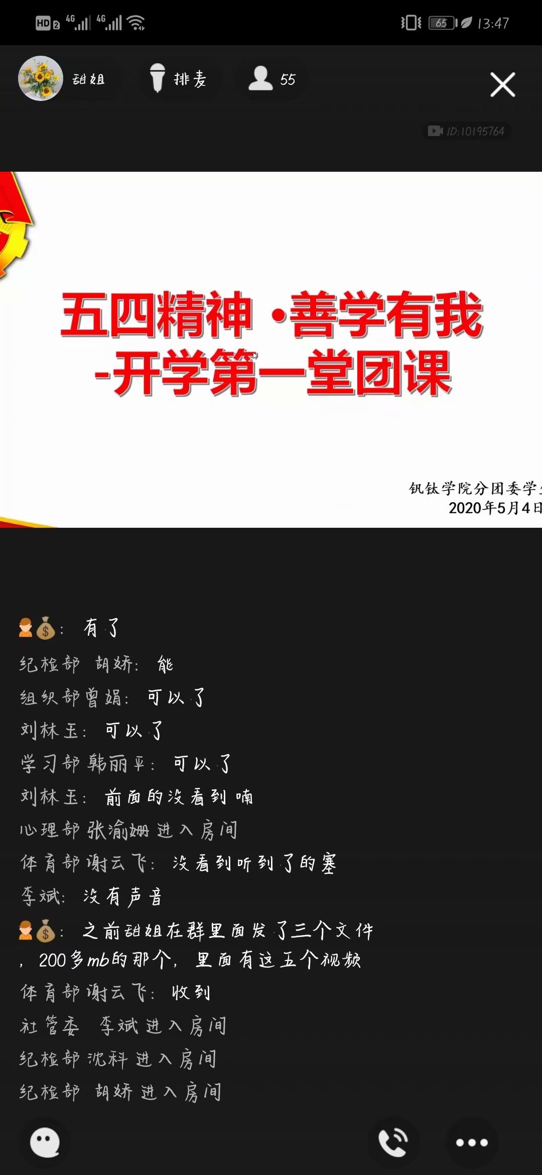 5月4日下午,为向同学们传递五四精神,我院于QQ群课堂中开展了“五四精神•善学有我”系列活动,我院分团委书记刘甜甜担任主持人,全体团委学生干部参加了本次活动。
