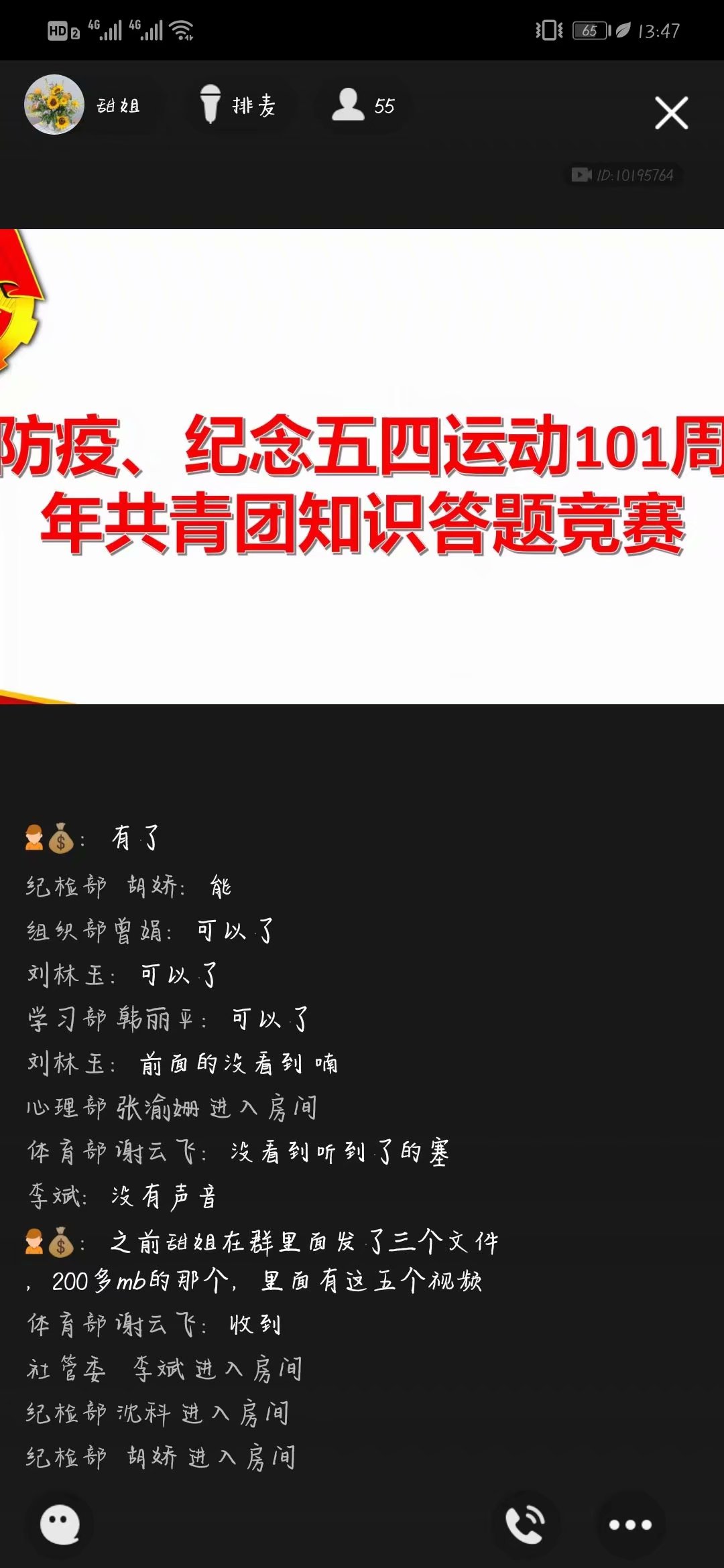 完成考勤工作后,首先由刘甜甜老师播放了五个关于团课的视频,并在视频播放结束后说明了今年是五四运动的101周年和共青团成立的98周年,向同学们阐释了五四精神,说明了其重要性,强调了青年的责任与担当。随后,进行了关于防疫、纪念五四运动共青团知识答题竞赛,活动以主持人出题,同学们抢答的形式进行。最后,刘甜甜提到了在疫情抗争中挺身而出的攀大青年志愿者们,对他们所体现的责任与担当予以高度赞扬,最终活动圆满结束。