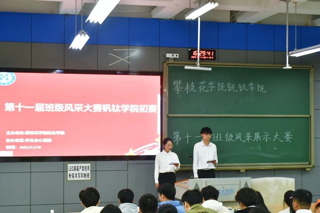 11月26日下午,钒钛学院在尚学楼114教室开展第十一届班级风采展示大赛,本次大赛出席评委由钒钛学院党委副书记兼纪委书记蒲洪、学生工作部邓安君、分团委书记鲍丽莹、2025级辅导员沙彩云、2023级辅导员王婷、学生科胡莉、学生科周雅敏等老师担任,2023级、2024级、2025级各班同学参与此次比赛活动。
