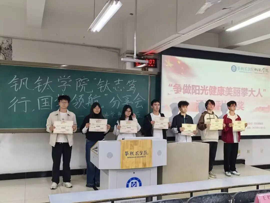 分享会尾声,“争做阳光健康美丽攀大人”评比颁奖环节如期举行。学院为活动中表现突出的班级、寝室及个人颁发荣誉证书,获奖代表手持证书合影留念,一张张青春洋溢的笑脸,展现出钒钛学子积极向上、奋勇争先的精神面貌。
