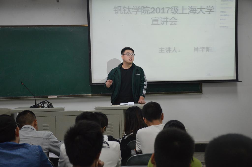 10月15日晚上,为了让我院优秀学子更加深入地了解上海大学联合培养班,于二教413举办了上海大学宣讲会,出席本次大会的有院长助理兼办公室主任安昀、17级辅导员沙彩云、主讲人肖宇阳和17级部分同学。