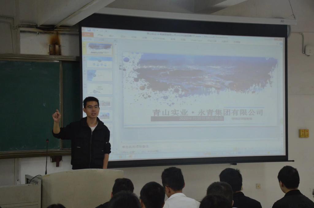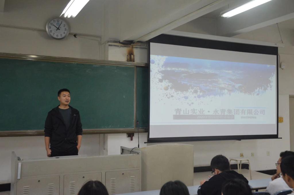 名称的来历及意义,并对公司负责的项目和各工业园区进行了详细介绍,让同学们对永青集团有了大致的了解。随后,王胤从实习生薪资、海外岗位、境内岗位、薪资结构、员工福利五个方面进行了宣讲,并通过播放青山实业宣传片的形式,让同学们较全面的了解了永青集团的发展理念。最后,针对同学们的提问,两位负责人耐心讲解。