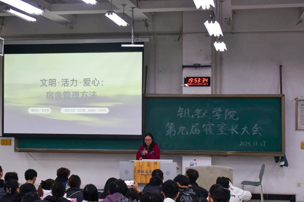 会上,纪检部李欣怡同学从卫生清洁、纪律规范、文化建设等核心维度,详细解读寝室评分标准与实施细则,为寝室日常管理提供清晰指引。优秀寝室长代表吕朋同学分享寝室氛围营造、责任分工协作等实用经验,为在场寝室长提供宝贵借鉴;特色寝室代表李紫霞同学通过生动案例展示文化建设创新成果,彰显钒钛学子积极向上的精神风貌。