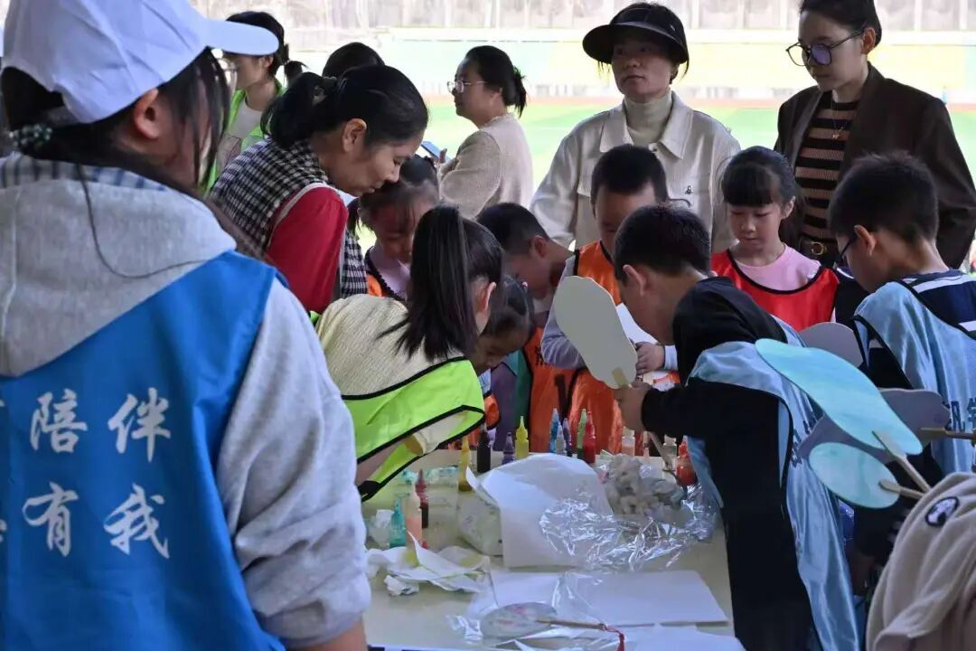 活动伊始,趣味飞盘体验火热开启。志愿者们耐心讲解飞盘玩法与安全注意事项,手把手指导孩子们掌握抛接技巧。绿茵场上,小小身影尽情奔跑、追逐、投掷,清脆的笑声随风飞扬,孩子们在挥洒汗水中释放童真活力,志愿者全程贴心守护,用陪伴为每一份快乐保驾护航。运动过后,诗意手作时光悄然上线。华韵汉服社带来非遗漆扇手工体验,志愿者们为孩子们讲解漆扇文化底蕴,细致示范制作步骤。素白扇面上,孩子们随心晕染斑斓色彩,一把把独具匠心的漆扇徐徐成型,既藏着孩童的奇思妙想,也尽显传统扇艺的雅致韵味,让非遗文化在指尖悄然传承。