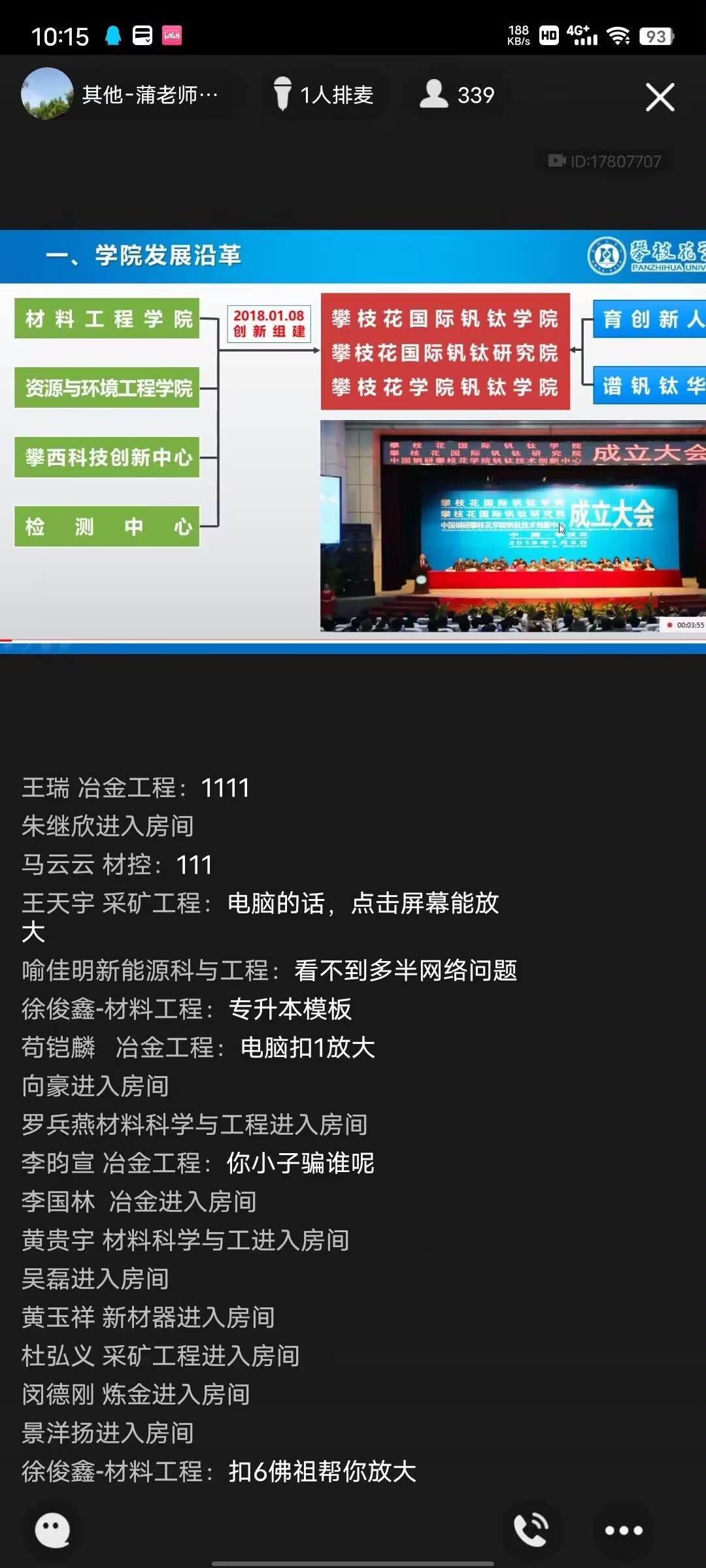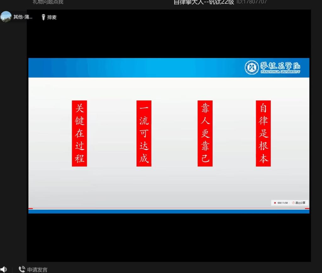首先,蒲书记向新生介绍了学校各位领导和学院师资队伍,让同学们了解新的老师并希望在今后学习中能与老师有良好的师生关系。接着,蒲书记向同学们介绍了钒钛学院的发展沿革,其中材料科学与工程尤为突出并突破了新起点,在过去时间里,学院也取得了众多成就,也希望同学们以这些成就为荣。然后,蒲书记介绍了学院人才培养方案,介绍了国家、西南地区、省级比赛项目,同学们纷纷表示出参赛兴趣。紧接着,蒲书记讲述了攀枝花学院:关键在过程、一流可达成、靠人更靠己、自律是根本的核心思想,并提出“自律攀大人”口号。最后,孙尚做了未来几天的时间安排,提出了军事训练的注意事项和军事理论课的重要性。