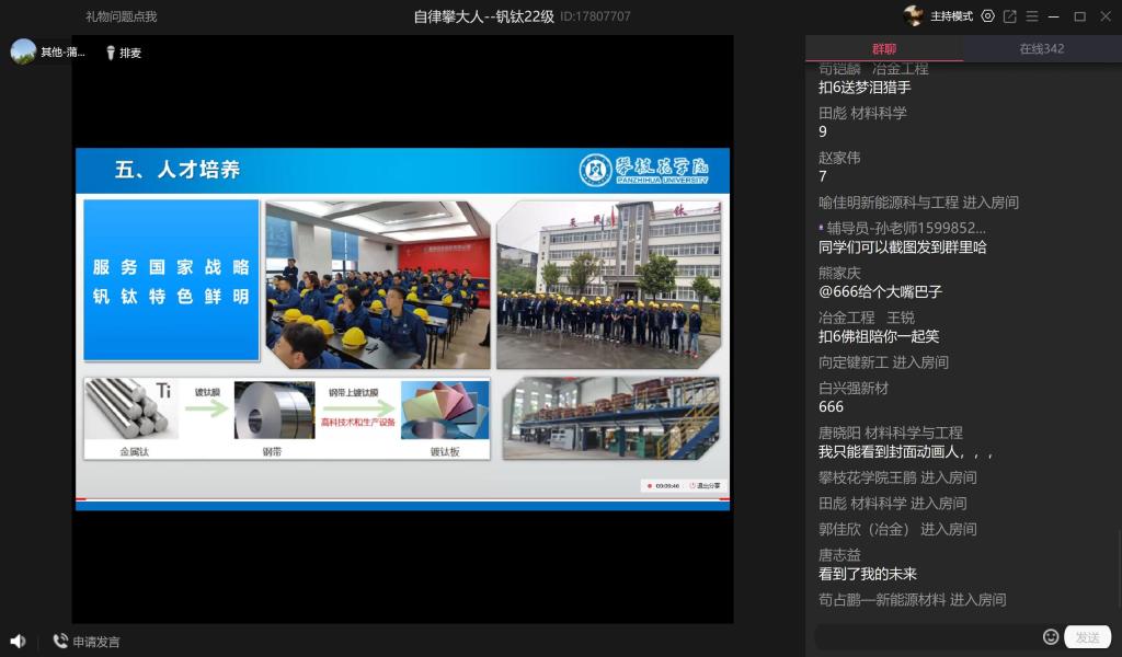9月23日,我院举行了钒钛学院2022级新生线上开学典礼,副院长吴恩辉、党委书记王鹃、党委副书记、纪委书记蒲洪、学生科全体老师、2022级辅导员孙尚出席本次活动,2022级新生参加。