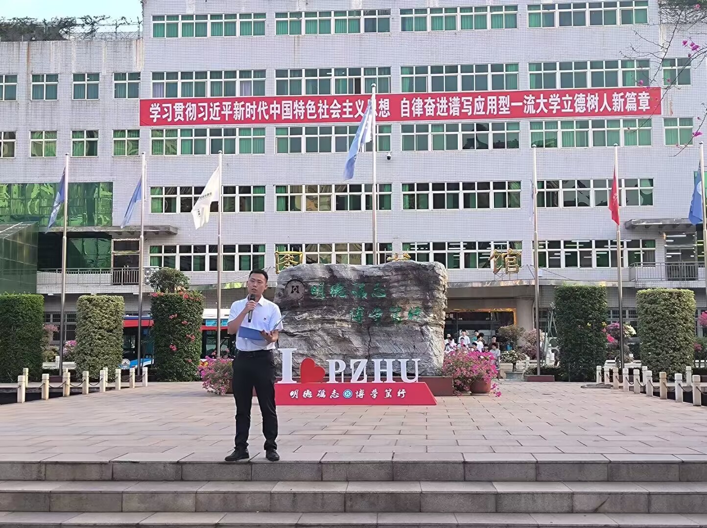 6月5日,我院在图书馆门口举行升旗仪式。钒钛学院党委副书记、纪委书记蒲洪、学生科全体老师、国旗护卫队全体成员、仪仗队全体成员、2022级和2021级部分学生参与。