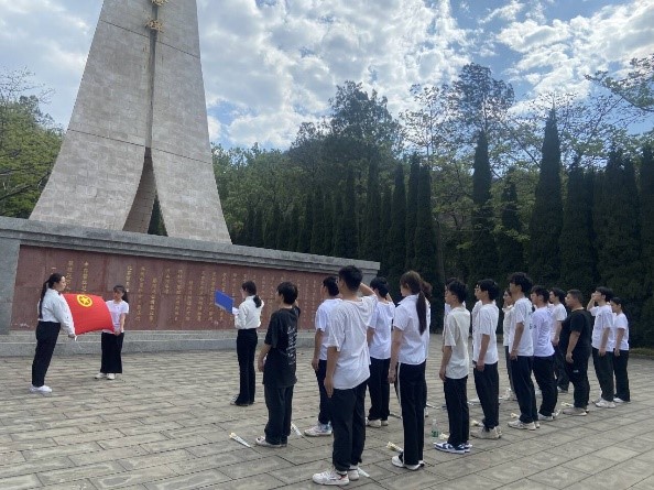 巍峨庄严的纪念碑前,青年党员、团员面向英雄纪念碑分别重温入党、入团誓词,向烈士们敬献鲜花,并有序绕行瞻仰纪念碑。