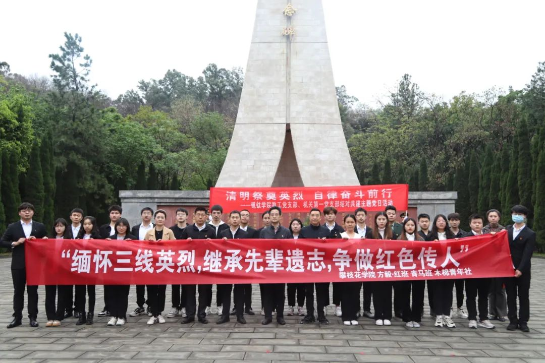 为深入学习贯彻习近平总书记关于弘扬英烈精神、传承红色基因的重要指示精神,深切表达对三线建设者们的崇高敬意,加强领导干部深入基层联系学生工作,创新探索党支部共建、与学生社团结对等方式,推进党建带团建,焕发组织青春活力,4月2日上午,党委书记王斌、党委副书记胥刚带领机关党委一支部、钒钛学院教工党支部和团委开展“清明祭奠英烈传承三线精神自律奋斗前行”——清明节主题党日活动,“青马工程”班、“方毅·红班”、木棉青年社、退伍军人学生代表参加活动。
