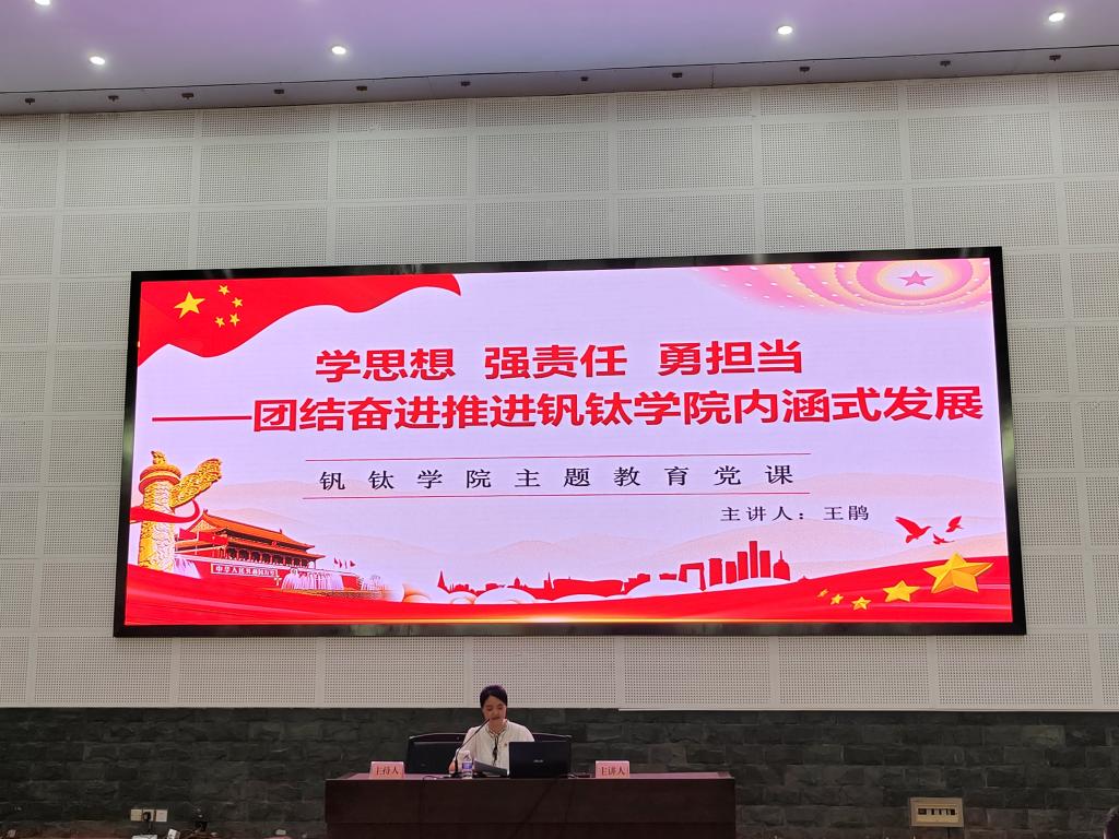 接下来,会议由院党委书记王鹃作题为“学思想 强责任 勇担当——团结奋进推进钒钛学院内涵式发展”的党课。王鹃同志立足钒钛学院内涵式发展,总结出“三二一”工作法推动主题教育走深走实走出成果。她强调,通过理论学习,要善于用习近平新时代中国特色社会主义思想中蕴含的世界观、方法论来指导工作,必须坚持党对教育事业的全面领导、坚持人的全面发展、坚持胸怀天下的理念开展工作,号召全体教师在主题教育的高质量推动中,在倾心从教、倾情爱生、争为人师中找寻自我实现,以实际行动推进学院高质量内涵式发展。