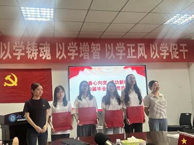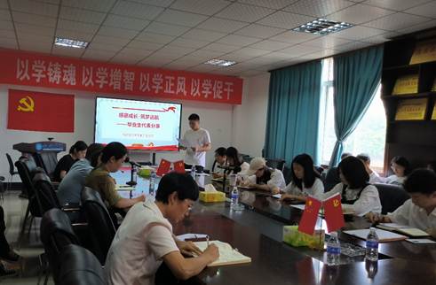 会议第一项由毕业生党员代表杨昊川、黄美淋、罗琴、徐珑滔4位同志以“感恩成长、筑梦远航”为主题分享大学生活和入党故事。他们回顾了四年的生活点滴,并对母校的辛勤培养表示感谢,纷纷表示未来将始终不忘入党初心,树立远大理想,在新的学习、工作岗位矢志奋斗,以高度的责任感和使命感迎接自己的未来。