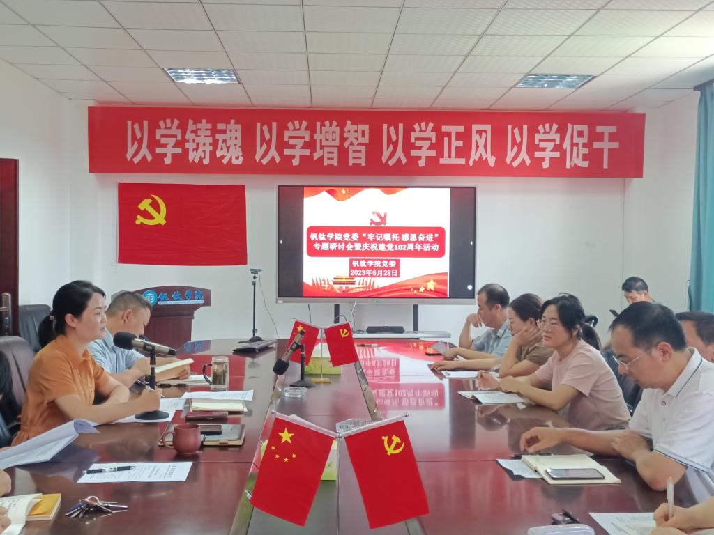 6月28日下午,钒钛学院在砺志楼303室召开“牢记嘱托 感恩奋进”专题研讨会暨庆祝建党102周年系列活动,会议分专题学习、专题研讨、庆祝建党102周年活动三个环节,由党委书记王鹃主持,师生党员及全体教职工参会。
