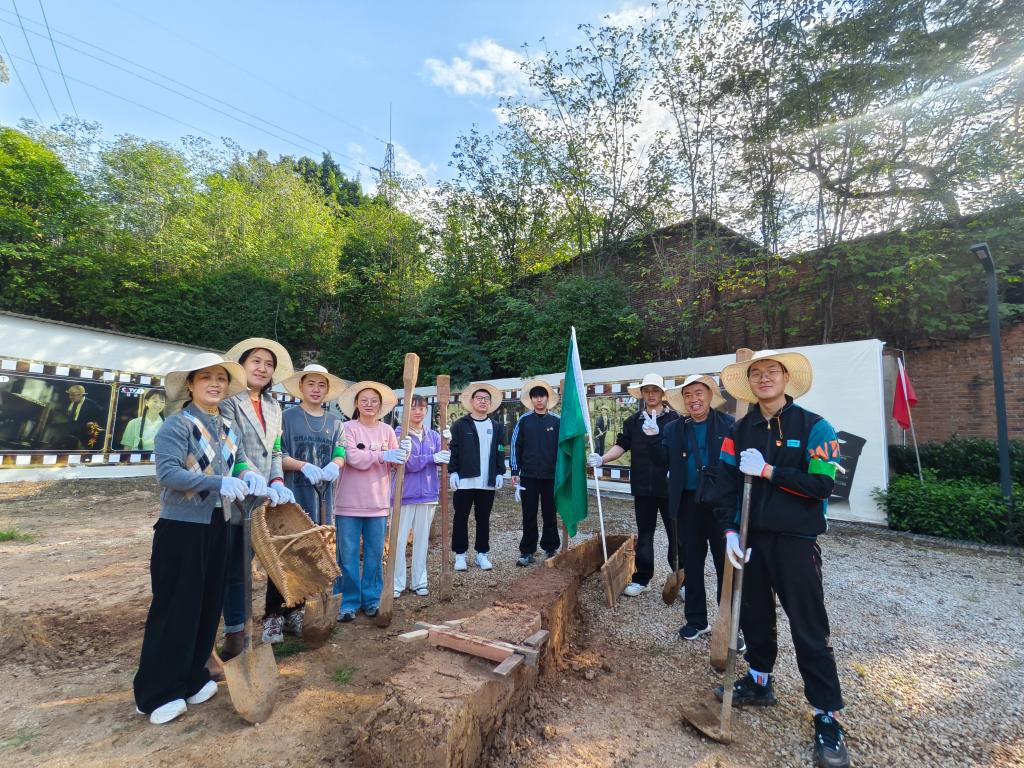 在干打垒体验环节,大家分为四组,亲手参与“干打垒”筑墙实践。大家就地取材,用土、石、草等材料协作筑墙,深刻体会到三线建设者“因地制宜、艰苦奋斗”的智慧与精神。紧接着的独轮车体验更是将活动推向高潮。党员们两人一组,一人推车、一人铲石,默契配合,重现了当年建设者推石运料、竞技争先的劳动场景。尽管汗水浸湿衣衫,但大家的脸上洋溢着自豪与感动,纷纷表示“只有亲身体验,才能真正理解什么叫‘艰苦创业’”。