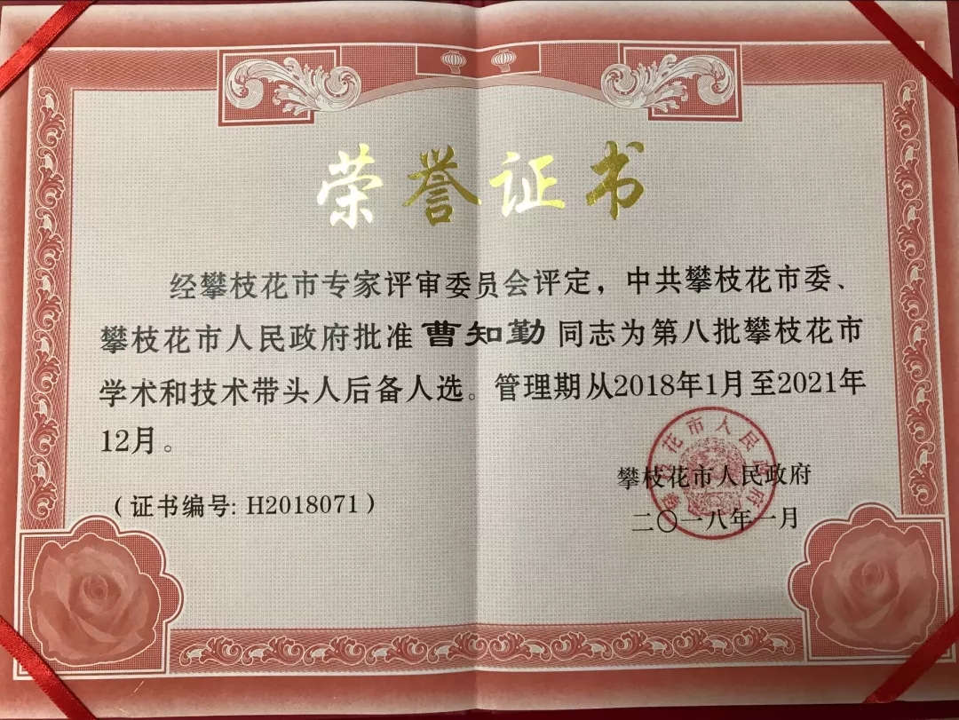 2017-2018年被评为“攀枝花学院学术先进”“攀枝花市学术和技术带头人后备人选”。目前主要研究方向为硬质合金、纳米材料及功能材料。