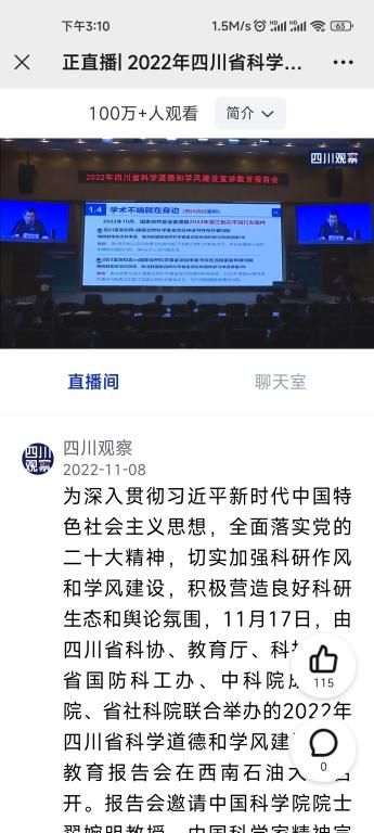 为深入学习贯彻二十大精神,切实加强科研作风和学风建设,积极营造良好科研生态和舆论氛围,2022年11月17日下午,钒钛学院组织学院师生收看2022年四川省科学道德和学风建设宣讲教育报告会,此次报告的主题为“弘扬科学家精神、涵养优良学风作风、践行高水平科技自立自强时代使命”。通过观看本次报告会,我院师生收获颇丰,感慨良多。他们纷纷表示,今后要以习近平新时代中国特色社会主义思想为指导,勇于探索、勤奋钻研、不计名利、献身科学。一定会在日后的科研和学习中,严格遵守科学道德规范,养成良好学风,坚守诚信底线,坚守学术道德底线。
