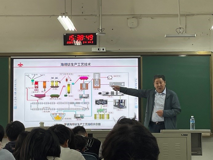 在技术解析环节,姜宝伟专家重点阐述了当前海绵钛制备的主流工艺——Kroll法,深入剖析了该工艺中镁、氯元素循环利用的核心技术原理,使在场师生对钛金属制备的技术逻辑形成了系统认知。随后,他从钛合金核心性能、海绵钛制备流程、钛合金多元应用三大维度,全面解读了钛金属的独特优势。结合详实案例,姜宝伟专家分别阐释了钛合金在航空航天、舰艇潜艇等高端装备制造领域的战略价值,在医用植入、人体修复等医疗健康领域的独特适配性,以及在消费电子、民用器皿等民生领域的广泛应用场景,多维度、全方位展现了钛金属产业的广阔发展前景。